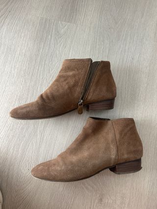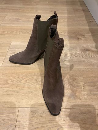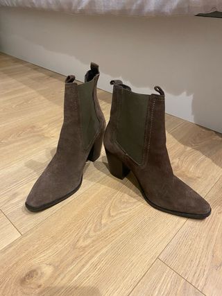 Botines estilo Chelsea de la marca Mango. - Material de serraje. - Color marrón. - Diseño elástico lateral. Usadas una sola vez.