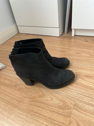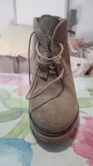 Botines de ante con cordones. - Tacón grueso. - Diseño tipo botín. - Cierre de cordones. - Usados exclusivamente en una ocasión. - Altura del tacón: 9’5 cm. - Altura de la plataforma anterior: 1’5 cm. 🫱🏻🫲🏼 Entrego en mano en: - Torre del Mar. - Puente Genil. - Córdoba.