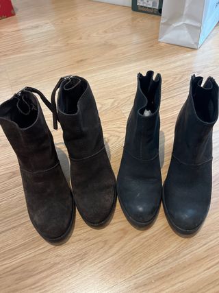 Lote de dos pares de botines de ante. Un par 20, los dos 35 - Un par en color marrón. - Un par en color negro. - Cierre con cremallera en la parte trasera.