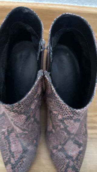 Botines con estampado animal print en tonos marrones y rosas. Un diseño llamativo y moderno. - Estampado de serpiente. - Punta fina. - Tacón.