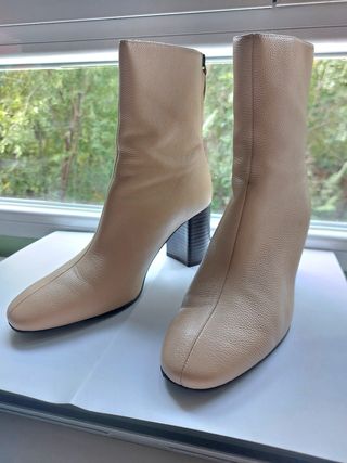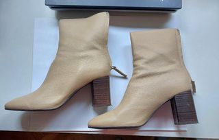 Botines color beige con tacón de madera. - Cierre con cremallera en la parte trasera. - Tacón grueso de madera.