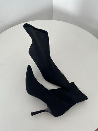 Botines de tacón de la marca Mango, con tejido elástico. Son talla 40 pero vale para una talla 39. Para se de punta fina son muy cómodos. - Diseño tipo calcetín. - Tacón grueso. - Punta fina.