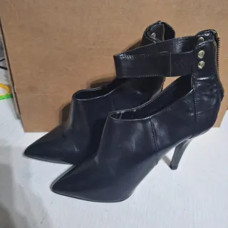 Elegantes botines negros con tacón. Cuentan con un diseño moderno y sofisticado. - Material exterior de piel. - Cierre con cremallera en la parte trasera. - Punta afilada. - Tira ajustable en el tobillo.
