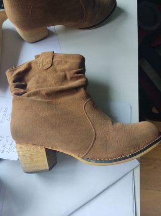 Botines de ante en color marrón con tacón. Cuentan con elástico en los laterales para facilitar su puesta.Puestos una vez.Made in China.Puse marca Zyga porque me obligaban a poner una marca. Hago envíos o entrego en mano en Salamanca.El tacón mide casi 9 cm de alto y 6 de ancho. - Material exterior: ante. - Tacón de bloque. - Diseño tipo chelsea.