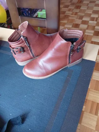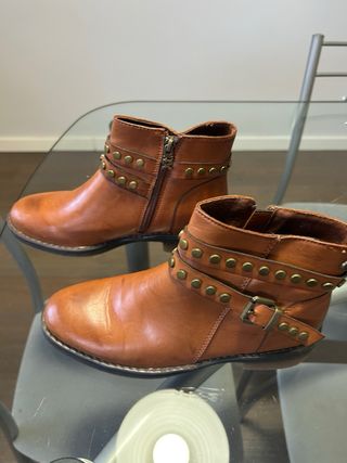 Botas de estilo casual en color marrón. Tienen un diseño moderno con detalles metálicos. - Cierre de hebilla. - Tacón grueso. también dos pares de zapatos, uno plano y otro con taconcito. Están en muy buen estado porque solo se ha usado para eventos formales, y después de conocer los separadores de dedos no le entran a mi hija. Los botines no son muy cómodos para largas caminatas, aviso.