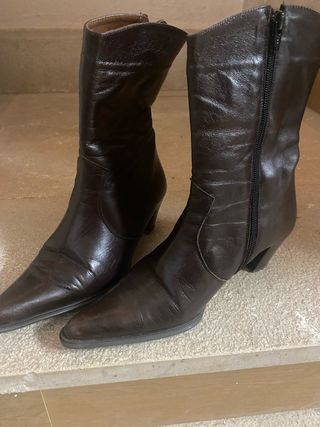 100% piel bovino. Piel de serraje. Con punta. Tacón bloque. Cierre de cremallera. El tacón mide 8 cm precio original 50€. No se han usado como se puede ver en la suela