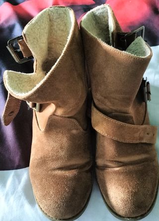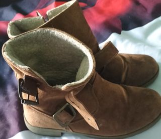 Botines de estilo casual, perfectos para el frío. Los vendo porqie me han regalado otros botines marrones y no tengo espacio. Han sido usados sólo 5 veces y se encuentran en muy buen estado. - Diseño plano con detalle de hebilla. - Forro interior de pelo sintético en la caña. - Suela de goma antideslizante. - Calentitos.