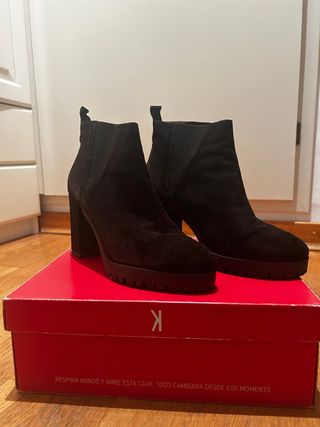 Botines de ante con tacón de madera y plataforma. - Tacón grueso de madera. - Detalles de tachuelas metálicas alrededor de la suela. - Paneles elásticos laterales para facilitar el calce.