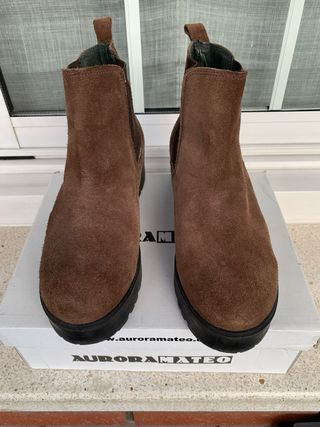 Cómodas botas de caña baja de piel (serraje). Diseño moderno y cómodo. Color marrón. Número 40. Servirían para un pie 39. De la marca Aurora Mateo de Barcelona. Como nuevas pues solo tienen unas tres puestas. - Material: piel - Suela gruesa y resistente. - Detalle de elásticos laterales. - Tirador trasero para facilitar su puesta.