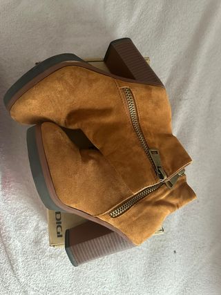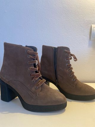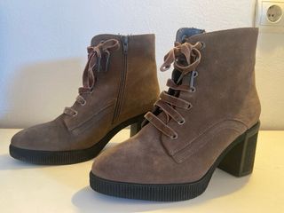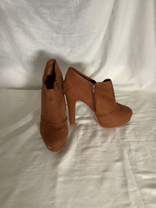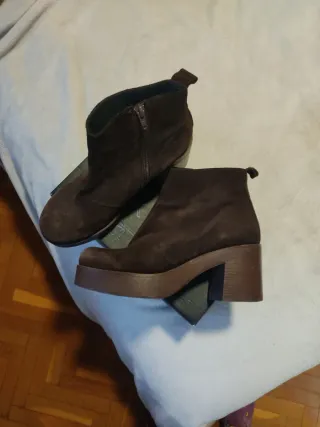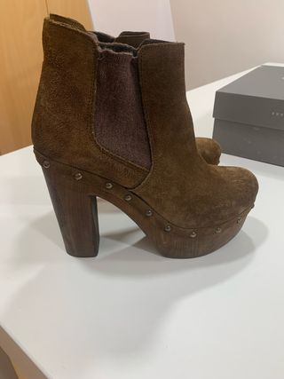 Botines de ante con plataforma y tacón grueso. Se han usado un par de veces. - Material exterior de ante. - Color marrón. - Cierre con cremallera. - Tacón cuadrado. - Plataforma delantera.
