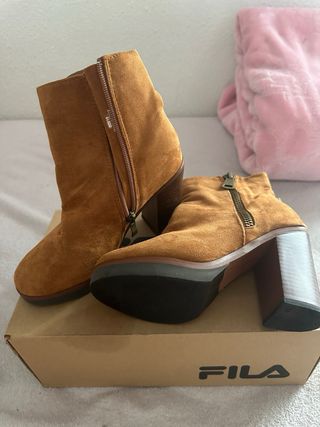 - Botas de antelina marrón - Con borreguito en el interior - Talla: 41 - Caña corta de 12 cm, con posibilidad de doblarla para mostrar el interior - Tacón de 9 cm y plataforma de 2 cm - Suela interior de cuero natural - Suela exterior original, de goma antideslizante - Con poco uso y en perfecto estado - Muy cómodas