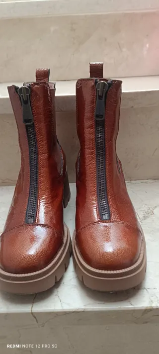 Botines de mujer de la marca Hispanitas en color marrón. He puesto nuevas, porque sólo las he llevado una hora, por ser incompatibles con mis plantillas. - Diseño moderno con cremallera frontal. - Suela de plataforma gruesa. - Acabado brillante.