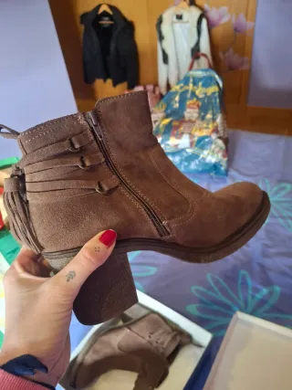 Botines de piel sintética en color marrón. Se encuentran en muy buen estado. - Cierre con cremallera lateral. - Diseño tipo botín. Vendo estos bonitos botines de color marrón camel. Son muy cómodos y están en perfecto estado, casi sin uso (puedes ver la suela en las fotos). • Color: Marrón • Cierre: Cremallera lateral (fácil de poner) • Estado: Seminuevos, muy cuidados. • Estilo: Ideales para otoño e invierno, combinan con todo. Hago envíos rápidos por la plataforma o entrega en mano en [Albacete]. ¡Cualquier duda, escríbeme! #botines #moda #talla43 #zapatos #invierno #brownboots #casual