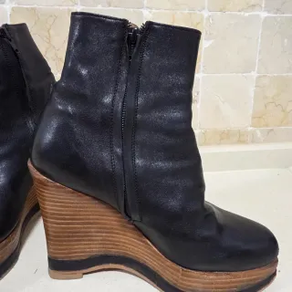 Botines de plataforma con un diseño moderno y llamativo. - Tacón de cuña con acabado de madera. - Cierre de cremallera lateral. - Punta redonda.