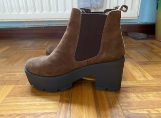 Botines de ante con plataforma y tacón de madera. - Material: Ante - Color: Marrón - Diseño: Botín chelsea con elástico lateral - Suela: Plataforma con suela dentada - Tacón: Tacón de bloque de madera vendo por mudanza