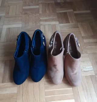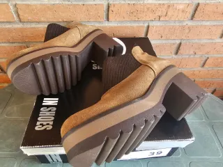 Botines de ante con tacón bloque. - Material: Ante. - Color: Marrón. - Cierre: Elástico lateral. - Tacón: Bloque grueso. - Suela: Plataforma con relieve. vendo por mudanza