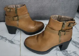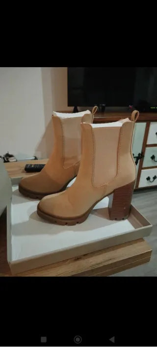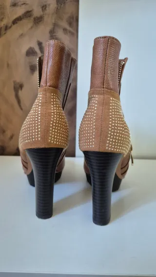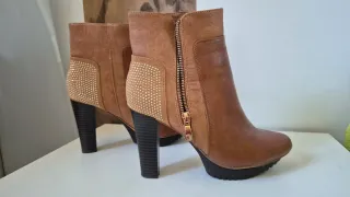 Botines de tacón con un diseño moderno y elegante. Dos tonos de marrón claro ( camel). La suela es de goma, no resbala . Totalmente nuevos, me los he puesto 2 horas en casa, pero no puedo con este tacón. - Detalles de pedrería en la parte trasera. - Cremallera lateral dorada. - Tacón grueso de 12 cm y plataforma de 2cm.