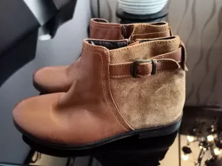 Botines de ante con un diseño moderno y detalles de hebilla. - Material: Ante - Color: Marrón - Cierre: Hebilla ajustable Usados una vez.