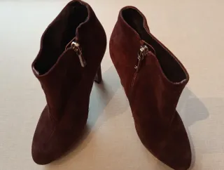 Botines de ante en color marrón. Modelo 25481133. Precio original 109,99€. Nuevos sin estrenar. - Diseño de caña corta. - Cierre lateral con cremallera. - Punta fina. - Tacón bajo.