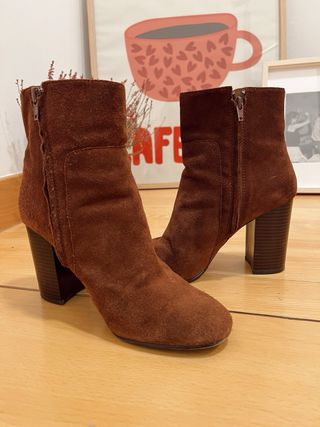 Botines de ante, color marrón. Usados muy pocas veces. Son de Mango. Hay alguna rozadura en el tacón, aunque es imperceptible. La tela está en perfecto estado.