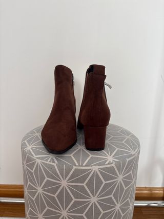 Botines de ante sintético en color marrón. Tacón de bloque y punta fina. - Cierre con cremallera lateral. - Tacón de 7 cm aprox.