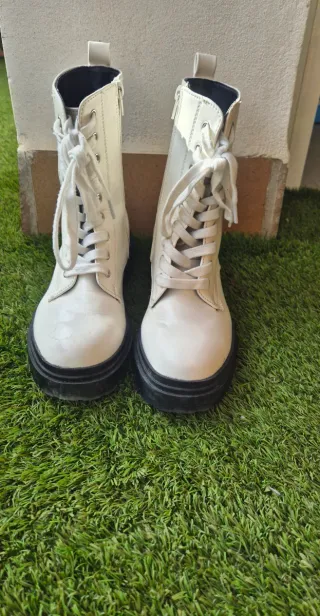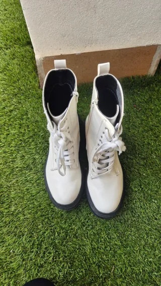 Botines de la marca Marypaz en color blanco. - Cierre de cremallera lateral. - Cordones decorativos en la parte delantera. - Suela de goma negra. - Tirador en la parte trasera.