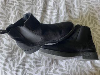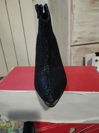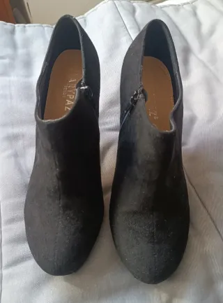 Botines de tacón alto 5/6 cm con acabado en terciopelo. - Diseño de punta fina. - Goma lateral para facilitar el calce. Estan completamente nuevos. Sólo se han puesto una vez en interior para un baile. Como se puede ver, está hasta la pegatina en la propia suela.