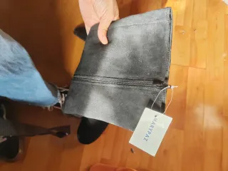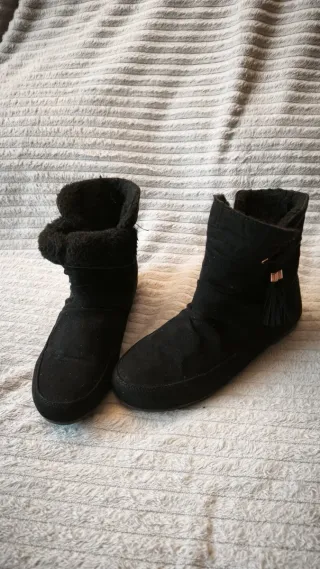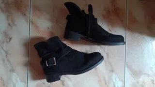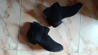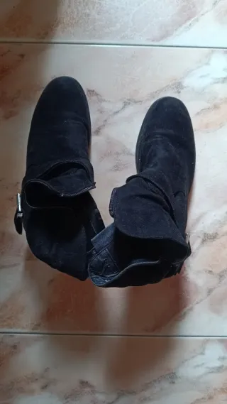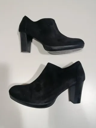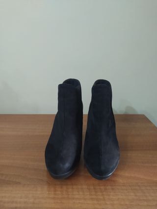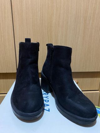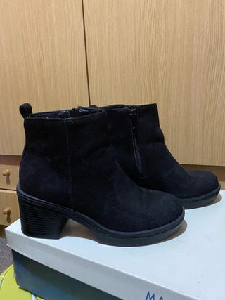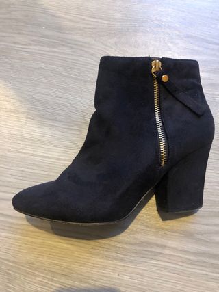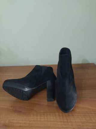 Botines negros de ante con tacón. - Tacón grueso y cuadrado. - Cierre de cremallera lateral. - Tirador en la parte trasera. - Se venden por falta de uso, solo se han usado dos veces. Yo tallo una 36 y me van perfectos.