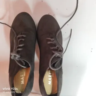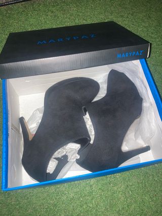 2° mano vendo botines marca Marypaz, de ante color negro, muy elegantes, Cremallera lateral, tacón de aguja de 9,5 cm y plataforma de 2,5cm. Gastos de envío no incluido en el precio.