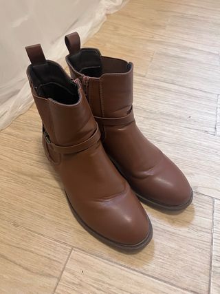 Botines de tacón en color camel, con acabado en símil piel. Número 40. Se cierran con cremallera. Suela antideslizante y tacón de unos 8 cm. Muy nuevas, poco uso. Un diseño elegante y versátil. - Cierre lateral con cremallera. - Tacón de altura media. Hago envíos.