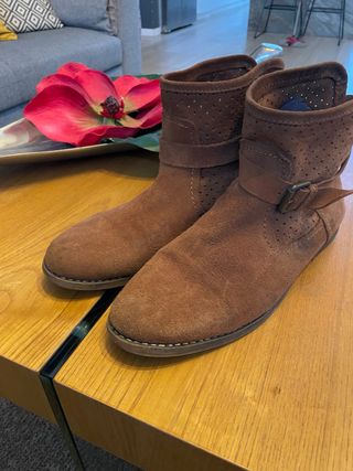 Botines de ante en tono marrón/camel, muy bien cuidados, sin manchas ni roces - Material: Ante - Diseño con abertura lateral - Tacón bajo de madera