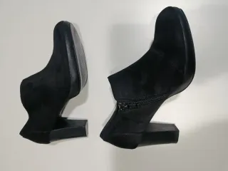 Botines de tacón alto, negro ante, ideales para fiestas o eventos especiales. Cuentan con un diseño moderno y elegante. - Cierre de cremallera lateral. - Plataforma delantera. - Tacón grueso y estable. - Como nuevos, muy poco uso - Talla 40