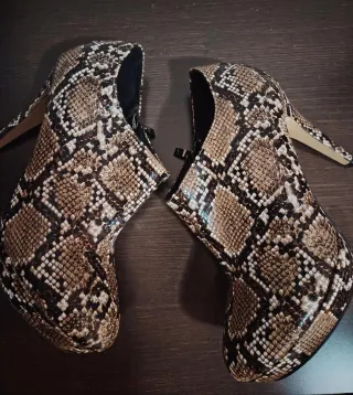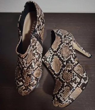 Botines de tacón con un llamativo estampado de serpiente. - Tacón alto. - Cierre de cremallera lateral. - Efecto piel de serpiente.nuevos a estrenar los compré y no los estrene .precio no negociable los dejo muy baratos