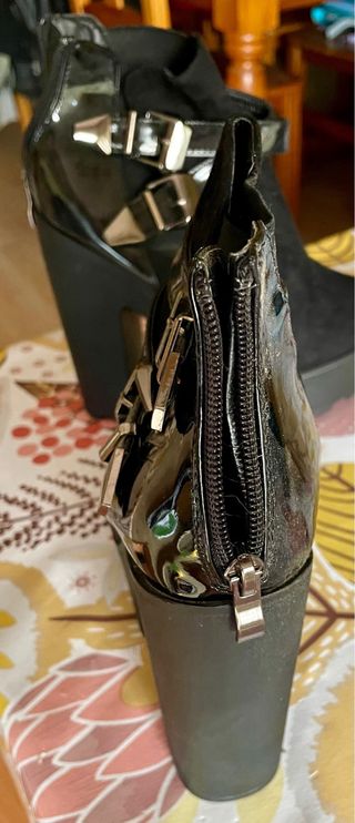 Botines negros con detalle de cremallera en la parte trasera. - Tacón grueso y plataforma. - Tiras decorativas con hebillas.