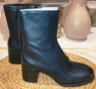 Botines de piel con tacón de la marca Massimo Dutti, muy cómodos. Tacón 10 cm de alto y botin 22 cm de alto. - Material piel. - Tacón grueso y alto. - Cierre de cremallera lateral. - Diseño elegante y versátil. Tacones en la parte trasera tienen 2 marcas, están algo picadas/peladas.