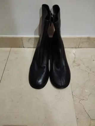 Botines de piel negra de Massimo Dutti, talla 39. PVP original 155 €. Muy poco uso, solo el de probarlas en casa. excelente estado: piel cuidada, punteras intactas y suela con desgaste mínimo (ver fotos). Elegantes, cómodos y atemporales.