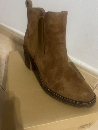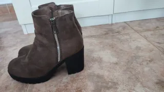-Botines color beige. -Material de ante y tacón revestido en el mismo material. -Talla 39. -Tacón ancho de 8 cm, cómodo y estable, ideal para llevar horas sin que cansen. -Punta estilizada que alarga visualmente la pierna y combina genial con jeans, vestidos o looks más arreglados. -Color neutro muy favorecedor, perfecto para otoño e invierno. -La suela está bastante desgastada y uno de los tacones presenta desgaste en el ante (ver fotos). El resto del zapato se encuentra en buen estado.