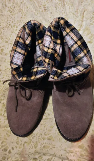 Botines de la reconocida marca S.Oliver, perfectos para la temporada de otoño e invierno. Marca: S.Oliver. Pertenecen a la línea "Denim District - Casual Style". Material: Ante (Serraje) de alta calidad. Color: Marrón topo (un color muy versátil). Estilo: Botines tipo chukka con cierre de cordones. Detalle Único: El borde se puede doblar para mostrar un llamativo forro interior de tela tartán/cuadros escoceses en tonos amarillo, azul marino y blanco. Suela y Tacón: Suela de goma resistente con un tacón de bloque cómodo y estable, ideal para caminar y para el día a día
