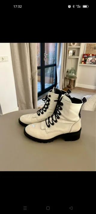 Botas de estilo militar en charol blanco, con cordones negros. - Acabado brillante. - Cierre de cordones. - Suela gruesa. Pequeña manchita rosa. Quitando eso están nuevas! Mustang xti refresh geox hispanitas nero giardini gioseppo piel .