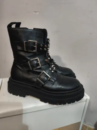 Botines estilo biker de Stradivarius, en color negro. Diseño robusto con plataforma gruesa, tres hebillas metálicas y tachuelas plateadas que aportan un look moderno y urbano. Cierre con cremallera lateral para mayor comodidad. Muy versátiles para otoño/invierno y looks casual o rock. Estado: Muy buen estado (poco uso). Talla: 39 Color: Negro Plataforma: Gruesa / suela track antideslizante Material: Sintético #Stradivarius #botines #botinesbiker #botinesnegros #plataforma #talla39 #calzado #moda #invierno #rockstyle #hebillas #tachuelas