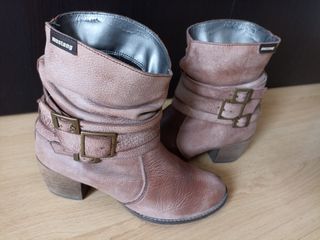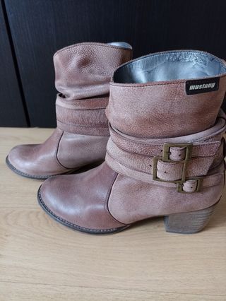 Botines mustang estilo envejecido con tacón cómodo. Talla 37. Por dentro, se han pasado un poco del uso, cómo se puede apreciar en las fotos, pero por lo demás están perfectos.