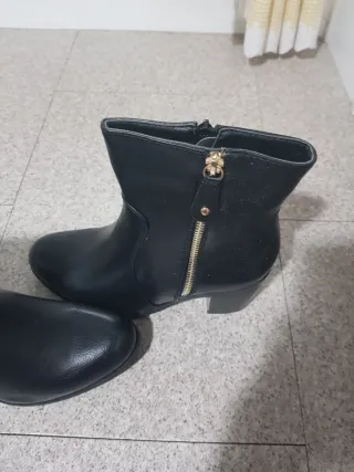 Botines de mujer. - Pone talla 40,pero equivale a un 39. - Piel vegana. - Cierre de doble cremallera lateral. - Diseño moderno y cómodo. - Interior forrado. - No conservo su caja ,se envían en otra caja.