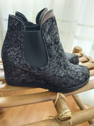 Botines de ante marrón, con cuña. Son de estilo informal y cómodos.