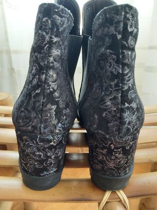 Muy cómodos. Botines tacón ancho. Cambiado las suelas el tacon sin rozes ni marcas Cremallera detras para cerrar.Están estupendos. Muy cómodos Tacon ancho.Piel ante.