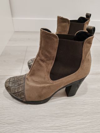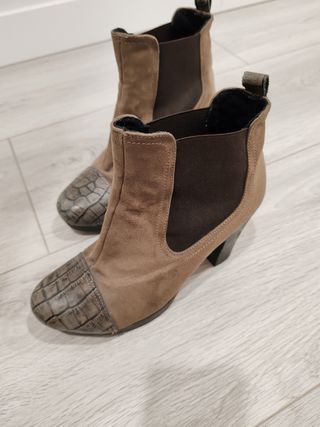 Botines de ante en color marrón claro. Son muy cómodos y elegantes. - Cierre con cremallera lateral. - Detalle de costuras. - Suela de goma.