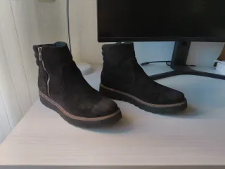 Botines de ante de la marca Roxy en color negro y talla 38. Cómodos y cálidos, forrados por dentro tipo borreguito. Cierre con cremallera lateral. En buen estado. Tienen desgaste en la parte del talón por dentro y la suela como se muestra en las fotos.
