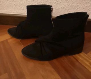 botín negro plano, con forma de lazo en el empeine y cremallera en la parte de atrás, muy cómodos con suela de goma, los he puesto un par de veces