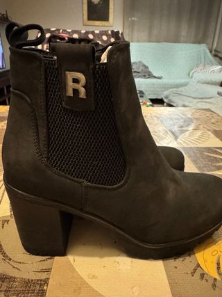 Botines de estilo Chelsea con un diseño moderno y elegante. - Material exterior tipo ante. - Detalle metálico con la letra R en la lengüeta. - Paneles elásticos laterales para facilitar el calce. - Tacón grueso para mayor comodidad y estilo.
