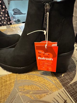 Precioso botín de mujer con tacón. - Diseño moderno y elegante. - Material tipo ante. - Tacón grueso para mayor comodidad. -Se puedo apreciar que la suela de goma está nueva. -Comodisimos y calentitos.