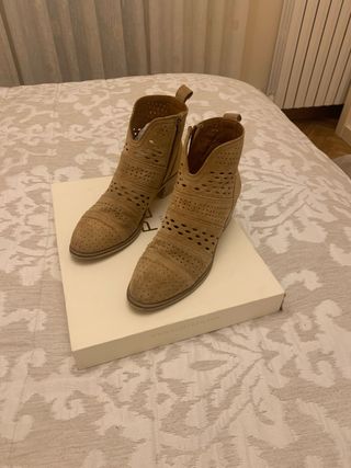 Botines de ante en color beige, talla 41. Solo puestas una vez . - Diseño tipo cowboy. - Tacón bajo y cómodo. - Detalle de botón en la caña.